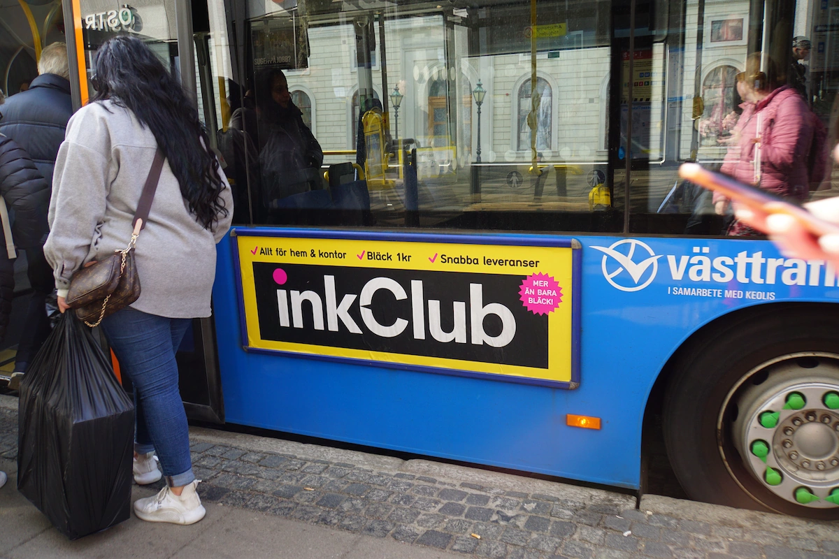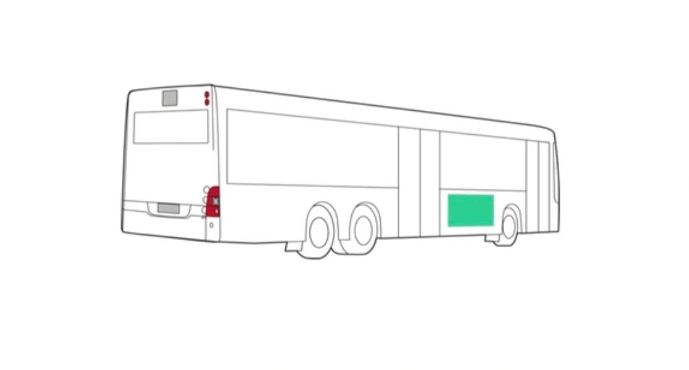 Våra Hop On-format för bussar är placerade mellan dörrarna, och är där väl synliga för både gångtrafikanter, bilister, resenärer i kollektivtrafiken och alla andra som bussen passerar. Den mindre ytan lämpar sig för rappa budskap som når en bred målgrupp både på nära och långt håll.