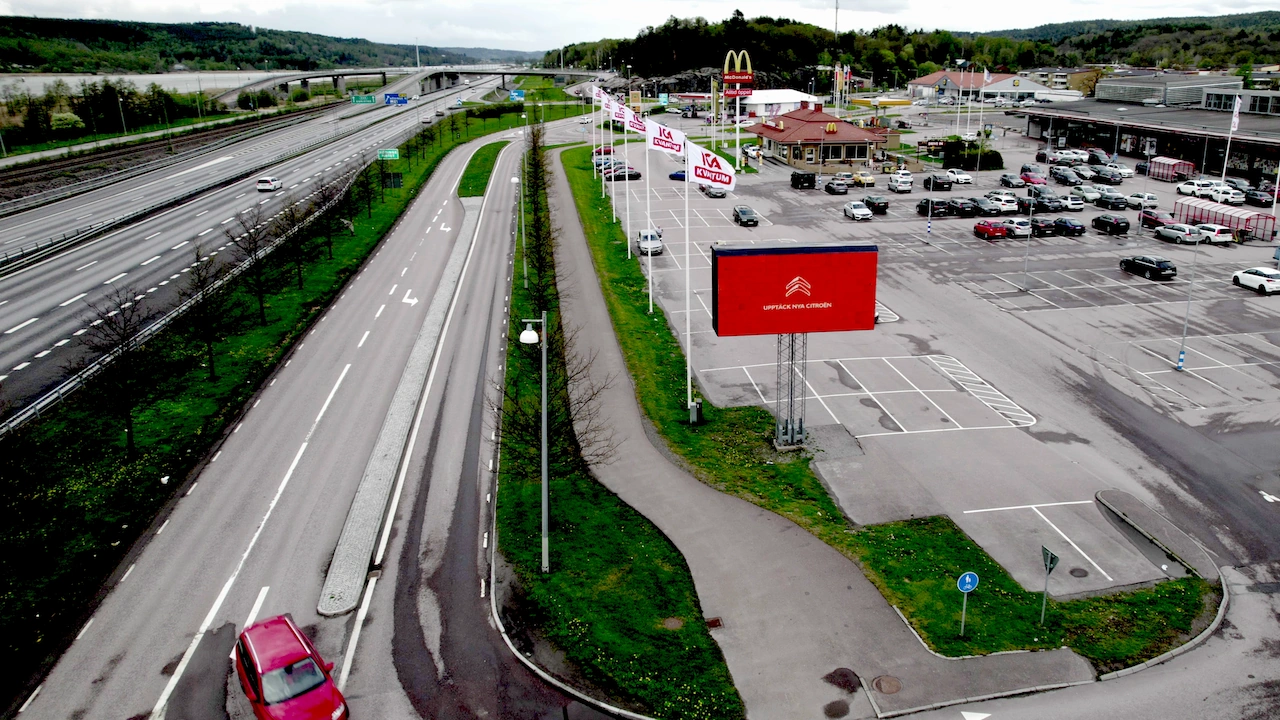 Roadsideskärm längst E45an mellan Göteborg och Trollhättan. Belägen vid Ale Torg, med höga trafikflöden och Impact. Här finner ni ett 30-tal butiker så som McDonalds, Ica Kvantum, Dressman, Kronans Apotek, Systembolaget och Lidl. I Ale kommun bor det 32 000 personer.