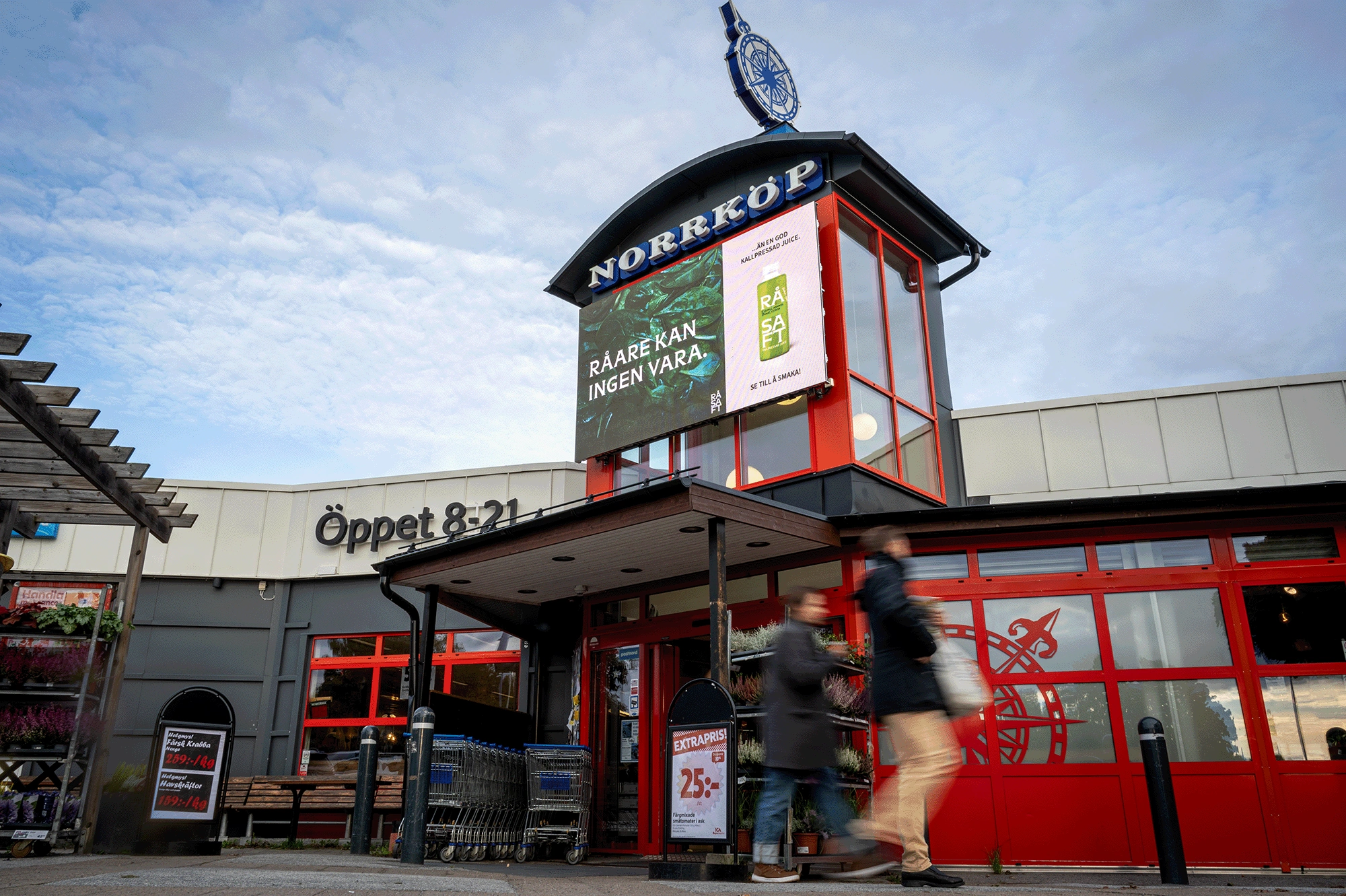 Skärm placerad ovanför entré till ICA Supermarket Norrtälje.
