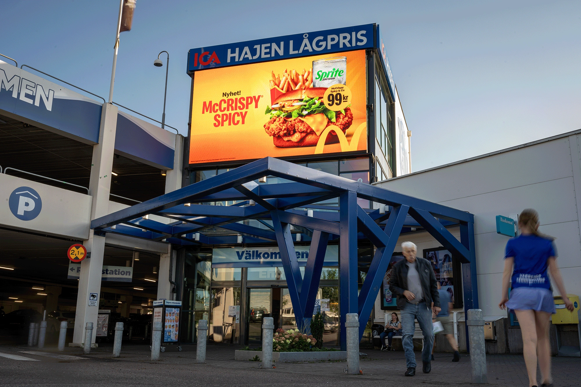 Skärm placerad ovanför entrén till ICA Kvantum Hajen i Varberg, syns från parkeringen och för besökare på väg in i butiken.