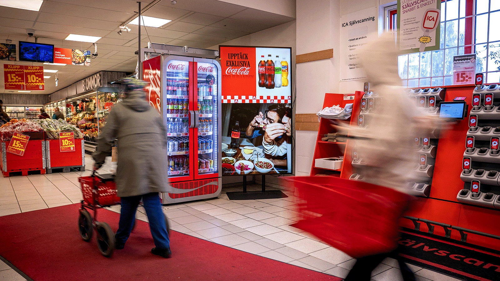 Indoor skärm i 16:9 format placerad precis innanför entrén till ICA Kvantum Åkrahallen. Här når ni alla besökare till butiken direkt innan köptillfället.